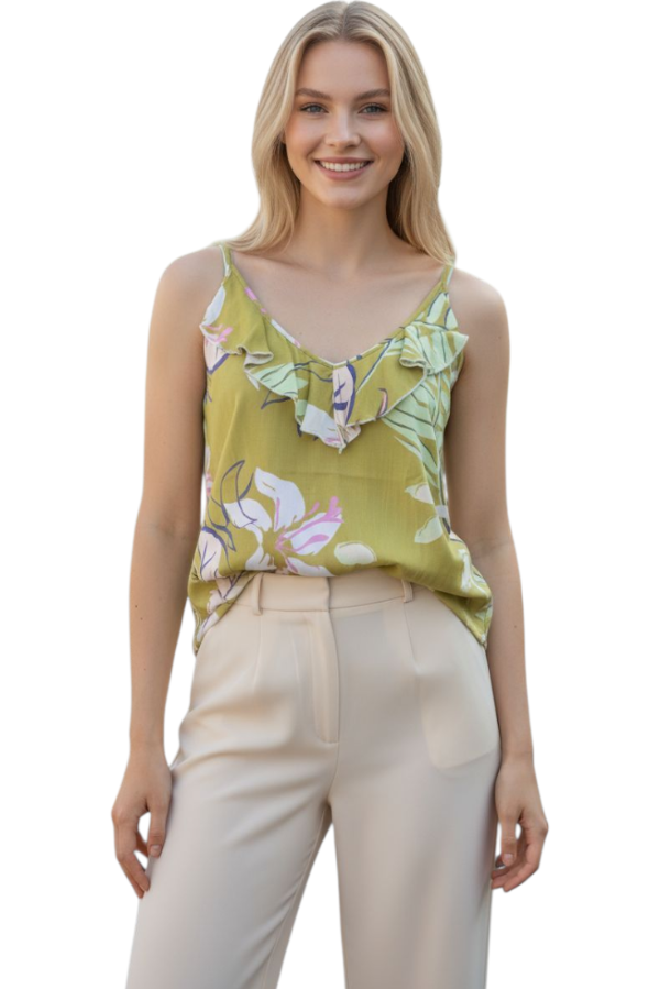 Musculosa con volado en el frente, confeccionada en lino con spandex, estampado floreado, breteles de tiritas.