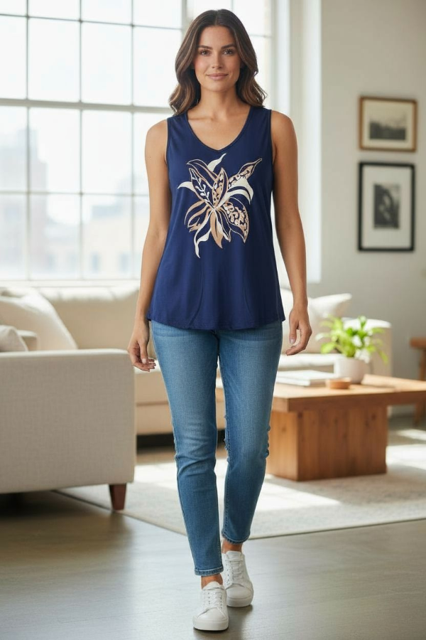 Musculosa de modal viscosa estampada, cuello en V, excelente caída que se adapta a cualquier contextura.