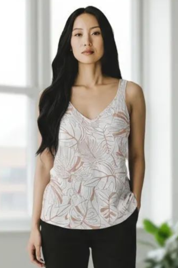 Musculosa estampada, confeccionada en modal, escote V con breteles de tiritas, doble tela a la altura del pecho.
