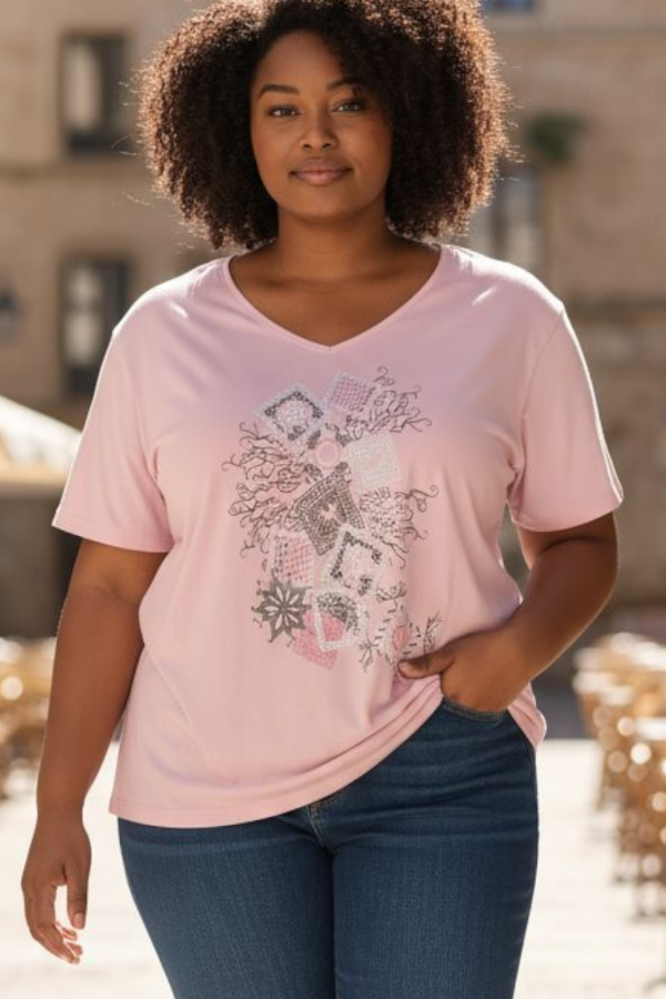 Remera de modal viscosa estampada, cuello escote en V, excelente caída que se adapta a cualquier contextura.
