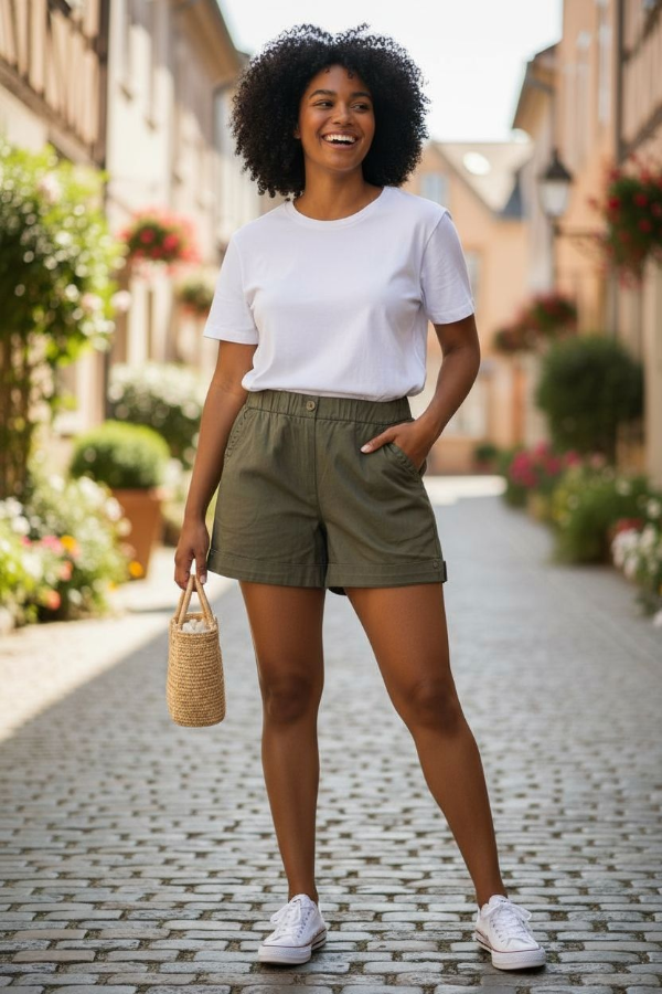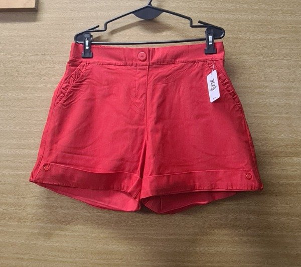 Short de bengalina elastizada, cuenta con bolsillos laterales con detalle de volados, cintura con elástico en la parte trasera y botamanga con botoncitos en los laterales.