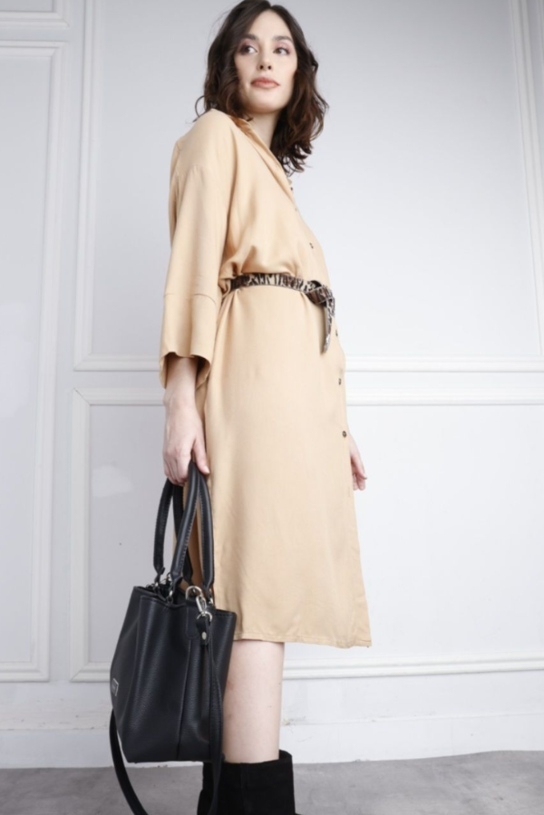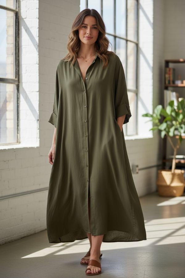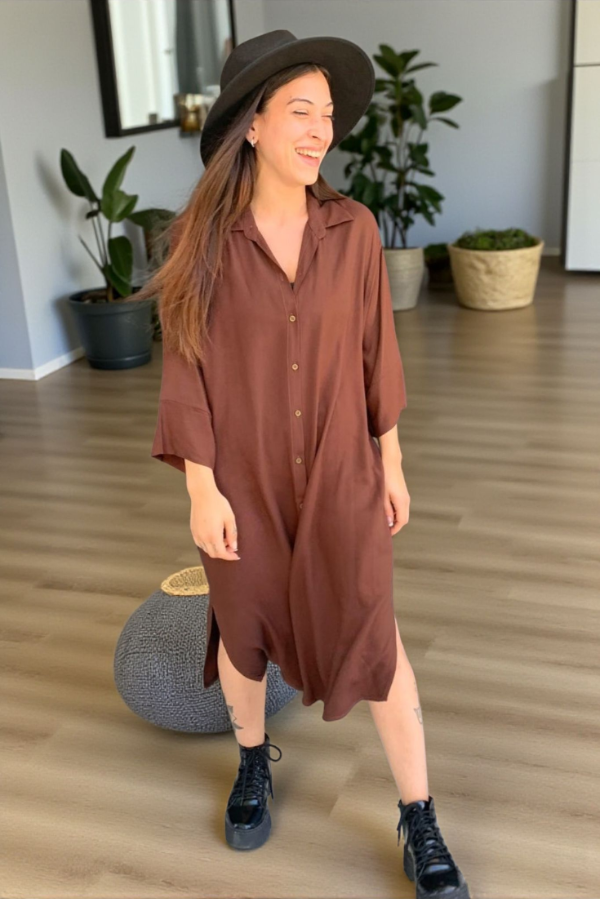 Vestido camisero de rayon twill liso, abotonado en todo su frente, con bolsillos, mangas 3/4 y tajo en los laterales.